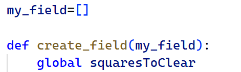 4: Почніть зі створення порожнього списку my_field у розділі глобальних змінних на початку програми. Та потім створіть функцію create_field для заповнення списку. Та сама функція буде потрібна для оновлення значення кількості безпечних квадратів, які залишилися