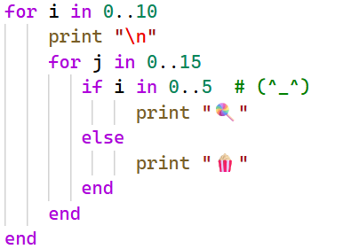 7: Зробіть схожі цикли з іншою умовою. В рядку і стовпчику має бути по 15 смайлів. Якщо j ділиться на 5, то виводиться 🐳, якщо ні – 🐯 (смайли можна замінити).