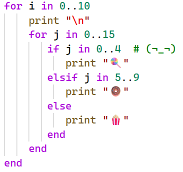6: Вже кипить мозок ? Ось вам приклад зі смайликами, допишіть його, вставивши вірні цифри. В рядку і стовпчику має бути по 20 смайлів. Цикл рахує від 0 до 20 відповідно. Якщо номер стовпчика j ділиться на 4, то виводиться донат. Інакше – піца.
