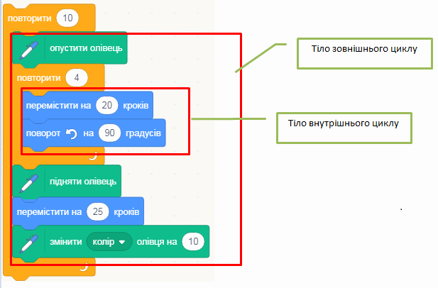Цикли можна вкладати один в одній. Це дуже часто використовується. Наприклад, щоб в кінці навчального року перевести всіх в наступний клас, треба зайти в список класів, далі зайти в список учнів кожного класу і додати один до номера класу. Тобто Миколка Шевченко, який вчився у 2-му класі, почне вчитися в 3-му і так само всі його однокласники. Але для цього треба спочатку зайти в список першого класу і там всіх перевести у 2-й, далі відкрити список другого класу і перевести нашого Миколку разом з однокласниками в 3-й клас. І далі для всієї школи. Це досягається вкладеними циклами.