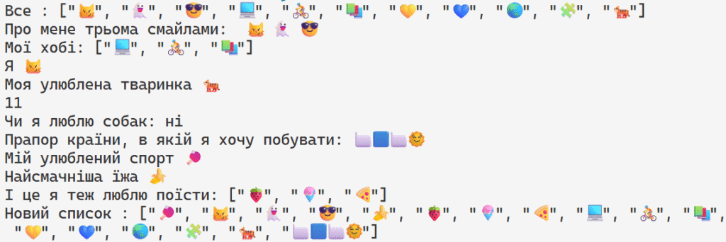 Сьогодні ми розберемо функції списків, а заодно і розкажемо про себе за допомогою смайликів! Ось, що приблизно має вийти: